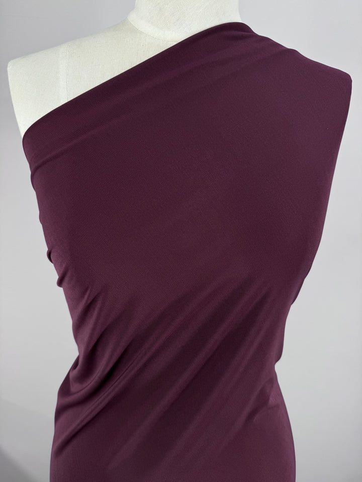 A beautiful plain, plum-coloured interlock twist yarn fabric. This opaque fabric has been knit to have great elasticity and a soft touch. This medium weight fabric is the perfect weight for tops, dresses skirts and loose pants.