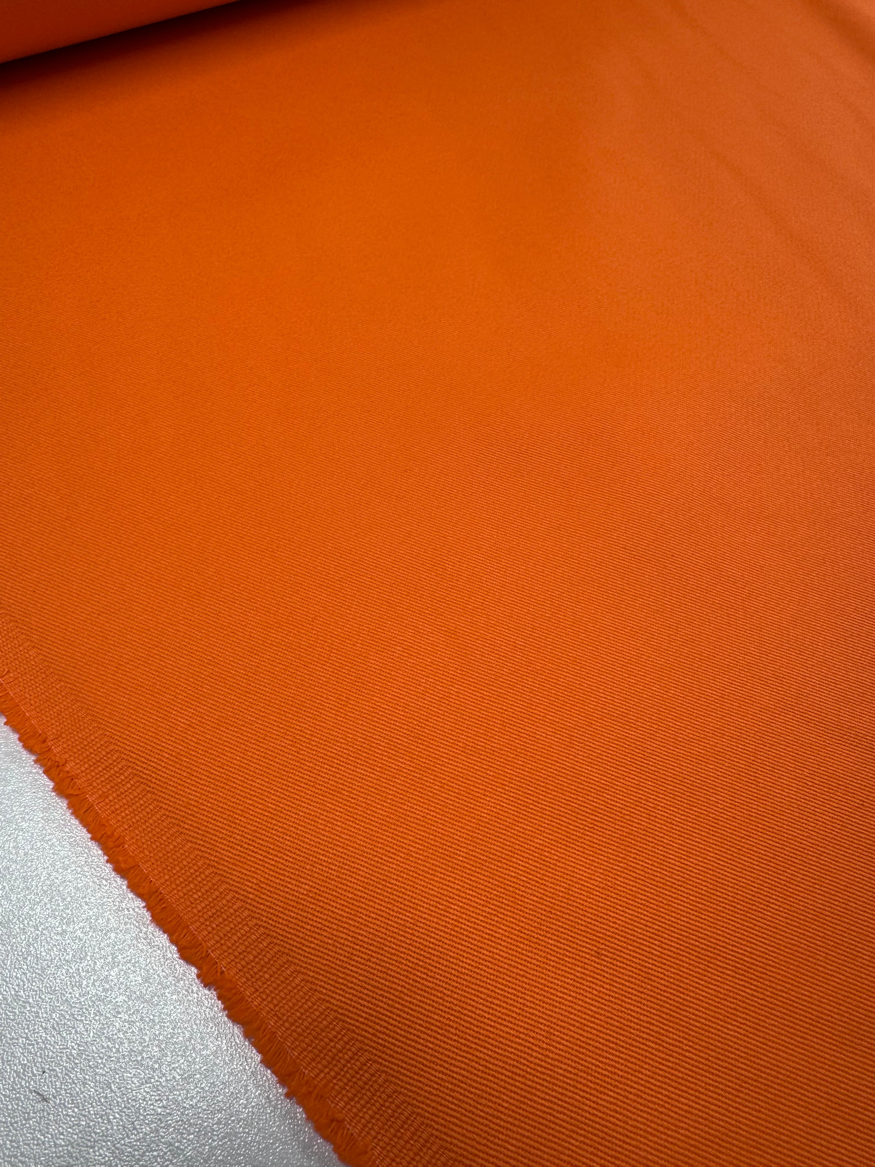 Our high-quality cotton drill in Orange will be sure to assist you with your next project! The bold colour seen in this fabric will provide a delightful addition to your wardrobe, whether it be used for a new dress, pants, shirt, skirts or some funky overalls.