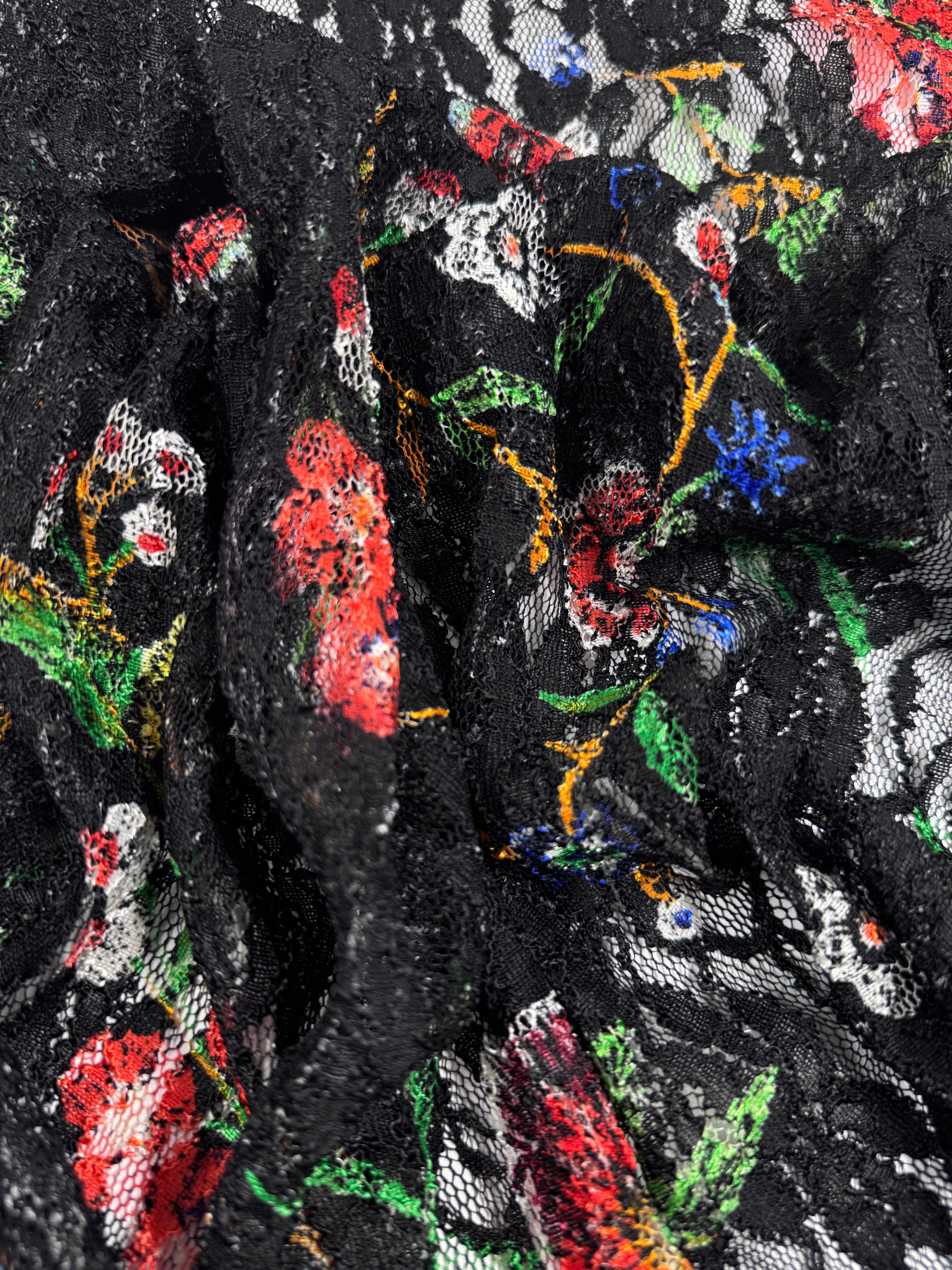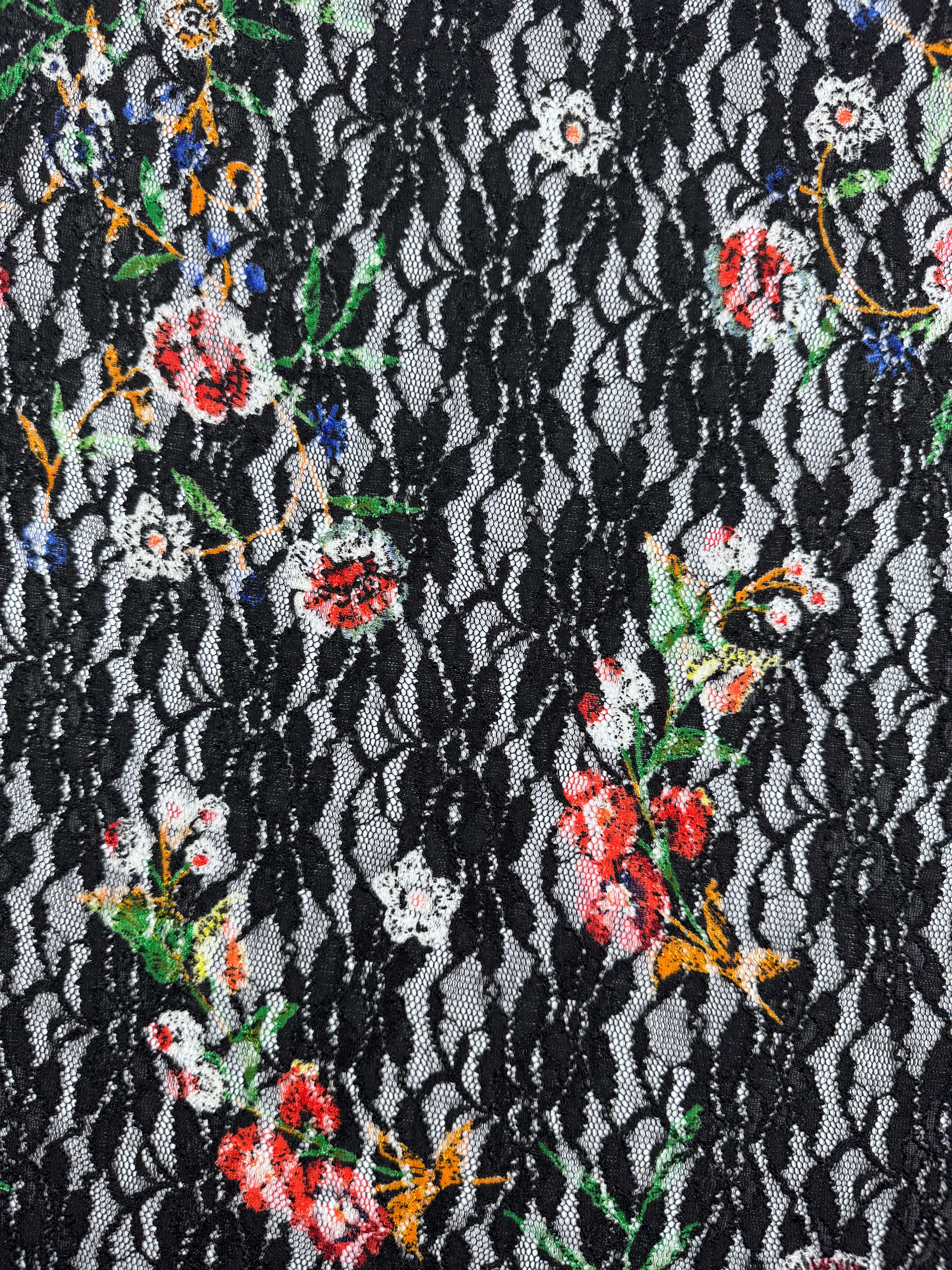 A delicate lace with gorgeous, Black background with rich red/orange embroidered-style florals, stretchy and boasts a beautiful drape. Perfect for beach cover and any style tops or dresses.