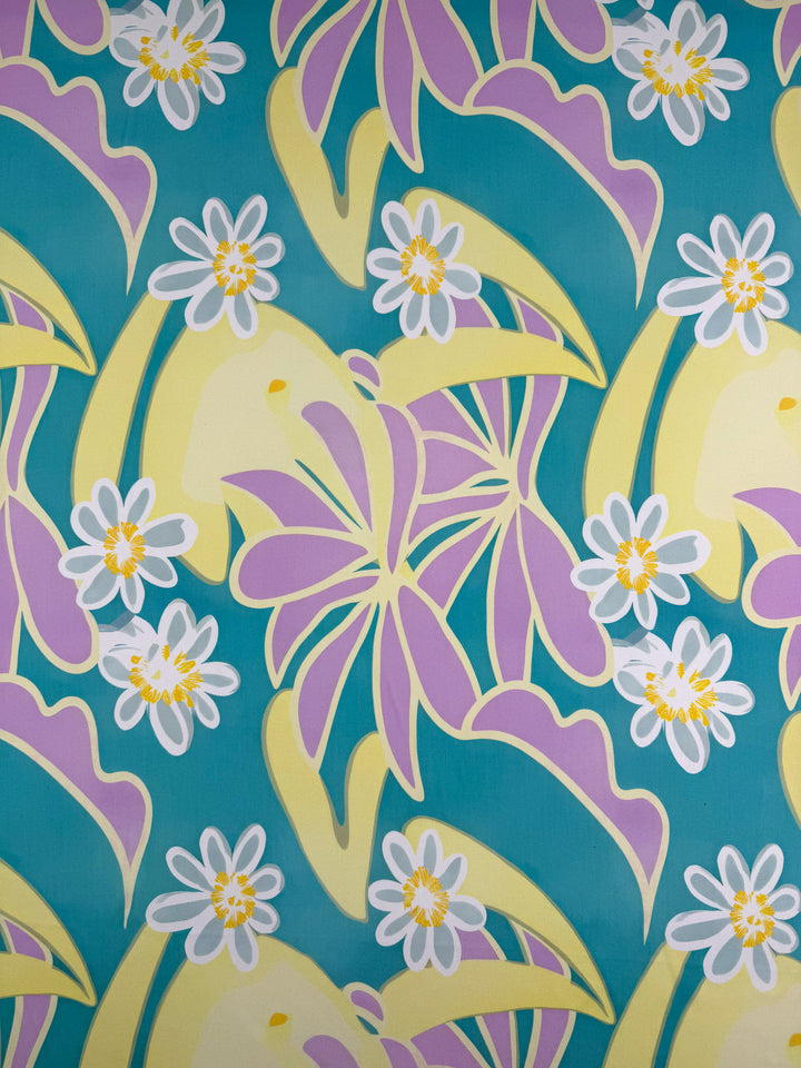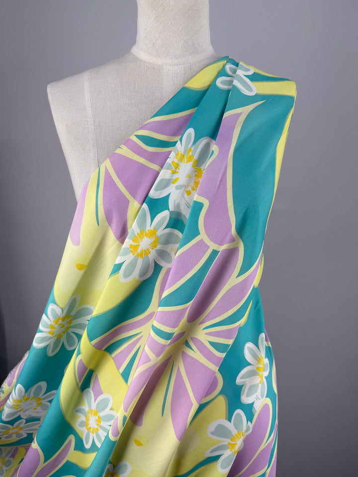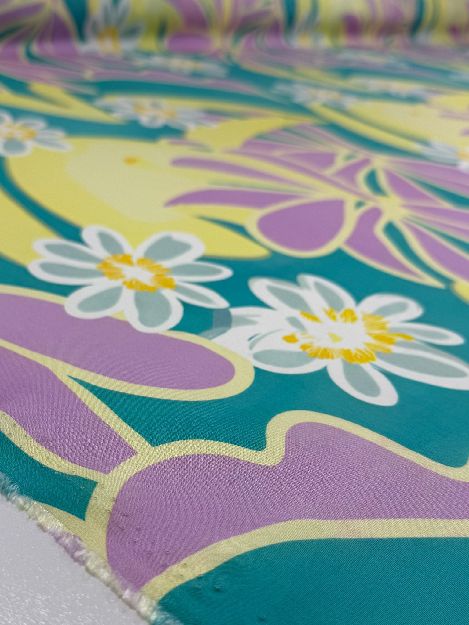 Our Designer Rayon showcases a beautiful and colourful fabric with vibrant prints that can be used for various purposes such as dresses, skirts, blouses, curtains, and more. Our collection showcases a soft, lightweight fabric with a smooth drape and a luxurious feel. Overall, rayon fabric offers both comfort and style, making it a versatile choice for any project. Daisy Bay features a lively floral print with daisy blooms and abstract tropical shapes in soft lavender, butter yellow, and crisp white, set against a fresh teal base.