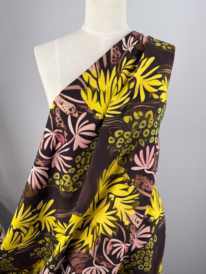 Our Designer Rayon showcases a beautiful and colourful fabric with vibrant prints that can be used for various purposes such as dresses, skirts, blouses, curtains, and more. Our collection showcases a soft, lightweight fabric with a smooth drape and a luxurious feel. Overall, rayon fabric offers both comfort and style, making it a versatile choice for any project. Earthwood draws inspiration from the forest floor, featuring layered foliage in deep greens, soft blush, and vivid yellow highlights over a dark earthy base.