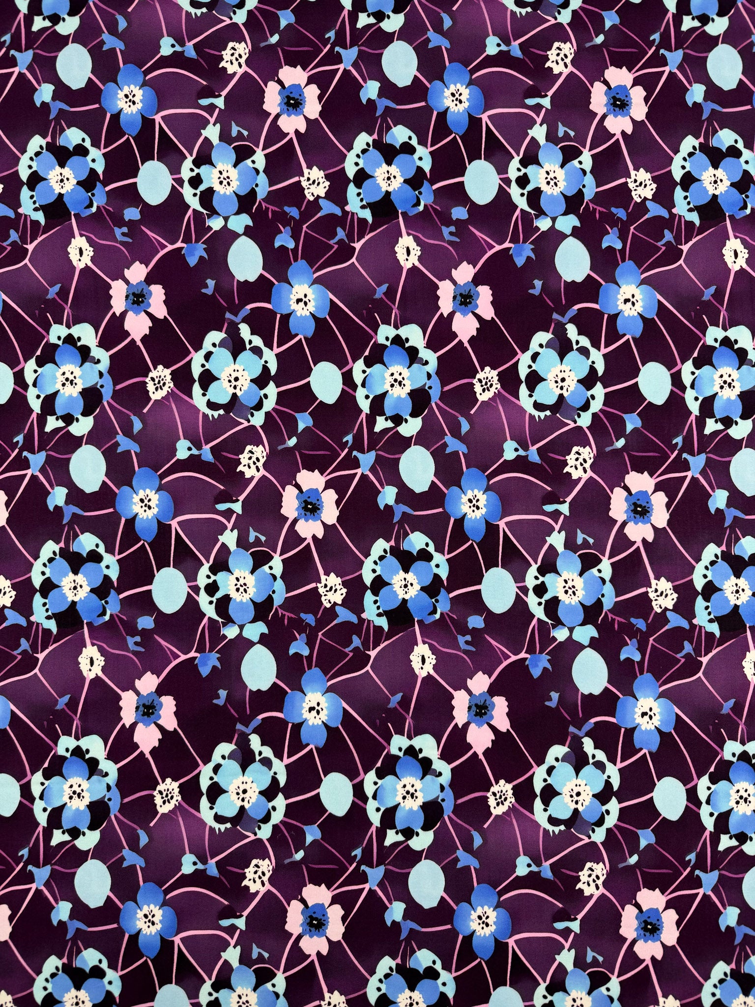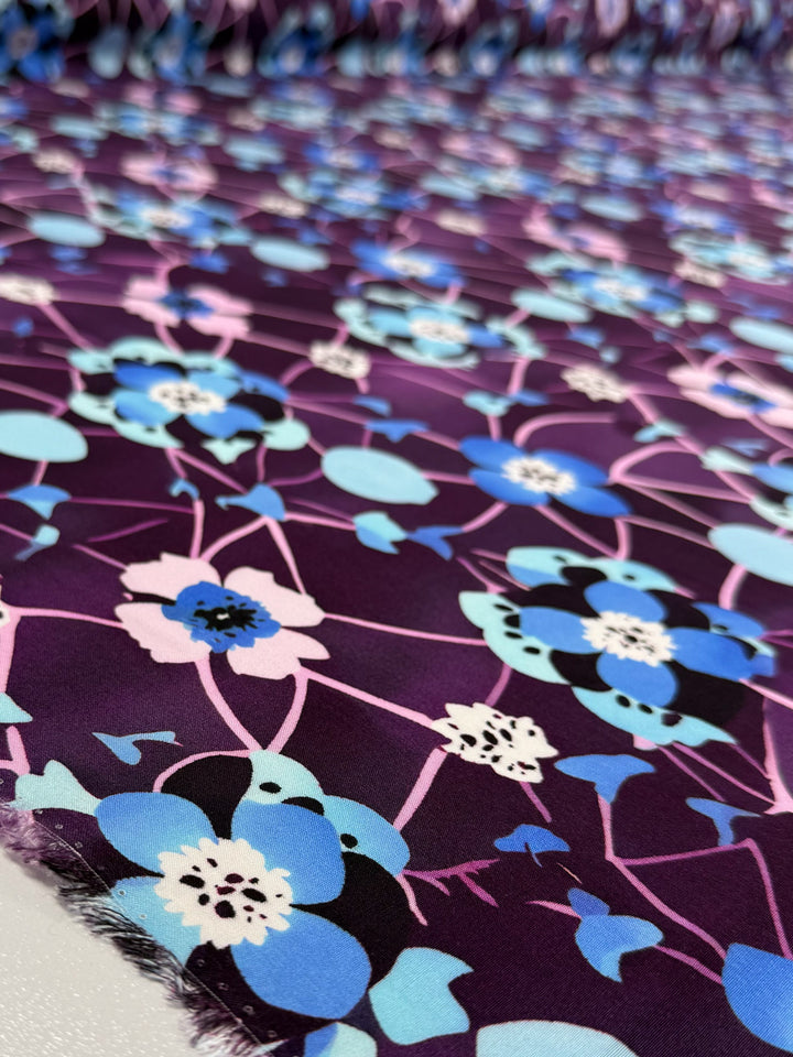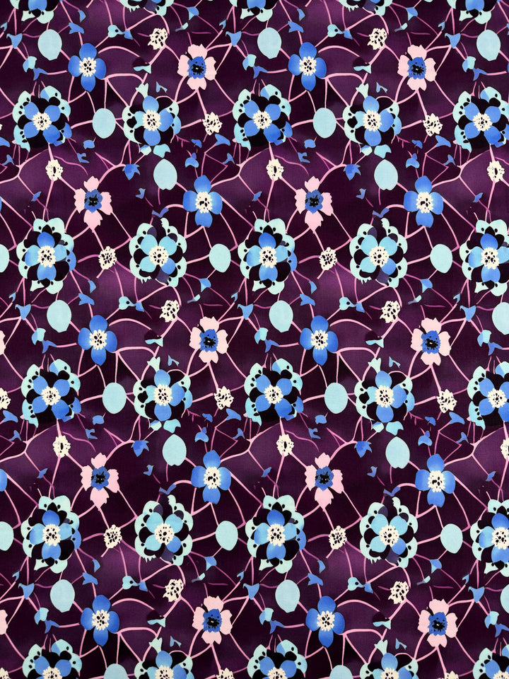 Our Designer Rayon showcases a beautiful and colourful fabric with vibrant prints that can be used for various purposes such as dresses, skirts, blouses, curtains, and more. Our collection showcases a soft, lightweight fabric with a smooth drape and a luxurious feel. Overall, rayon fabric offers both comfort and style, making it a versatile choice for any project. Luna Bloom features delicate floral clusters in tones of sky blue, lilac, and soft aqua, set against a rich plum base.