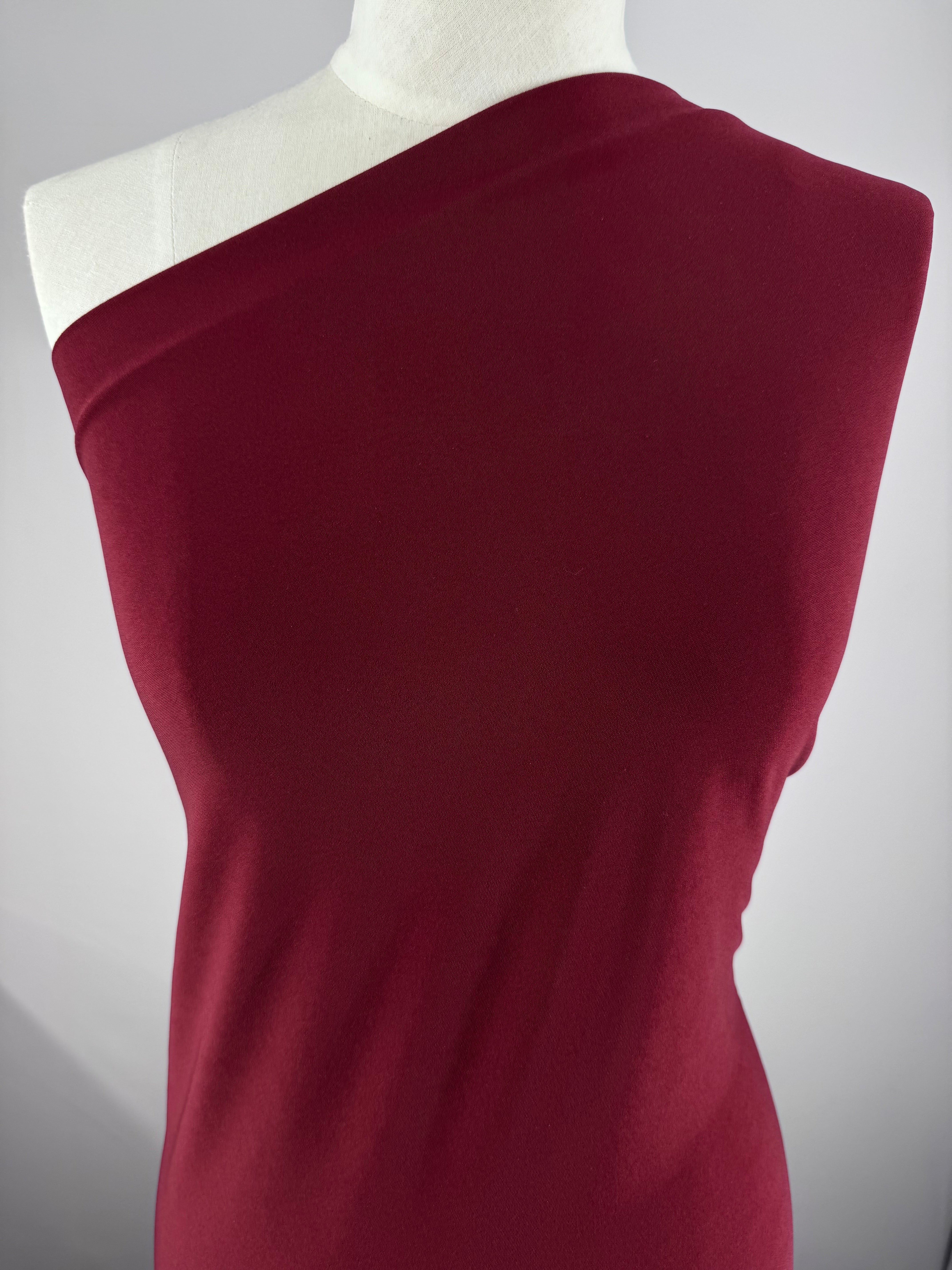 A beautiful plain, burgundy-coloured interlock twist yarn fabric. This opaque fabric has been knit to have great elasticity and a soft touch. This medium weight fabric is the perfect weight for tops, dresses skirts and loose pants.