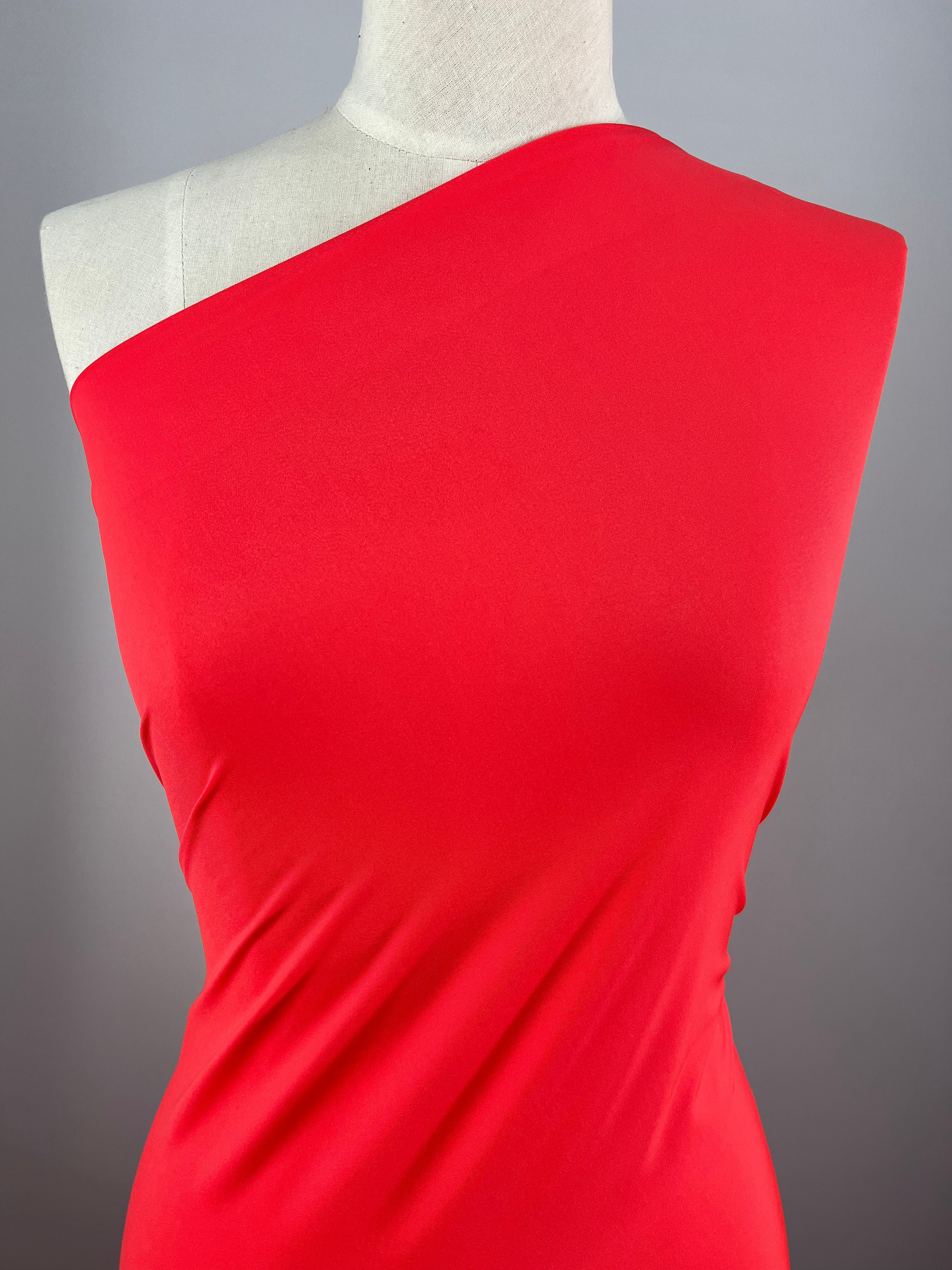A close-up of the Super Cheap Fabrics' Nylon Lycra dress in Fiery Red, displayed on a mannequin. The four-way stretch fabric appears smooth and form-fitting, with the left shoulder and collarbone exposed. The neutral background emphasizes the vibrant color and sleek design of this 155cm wide dress.
