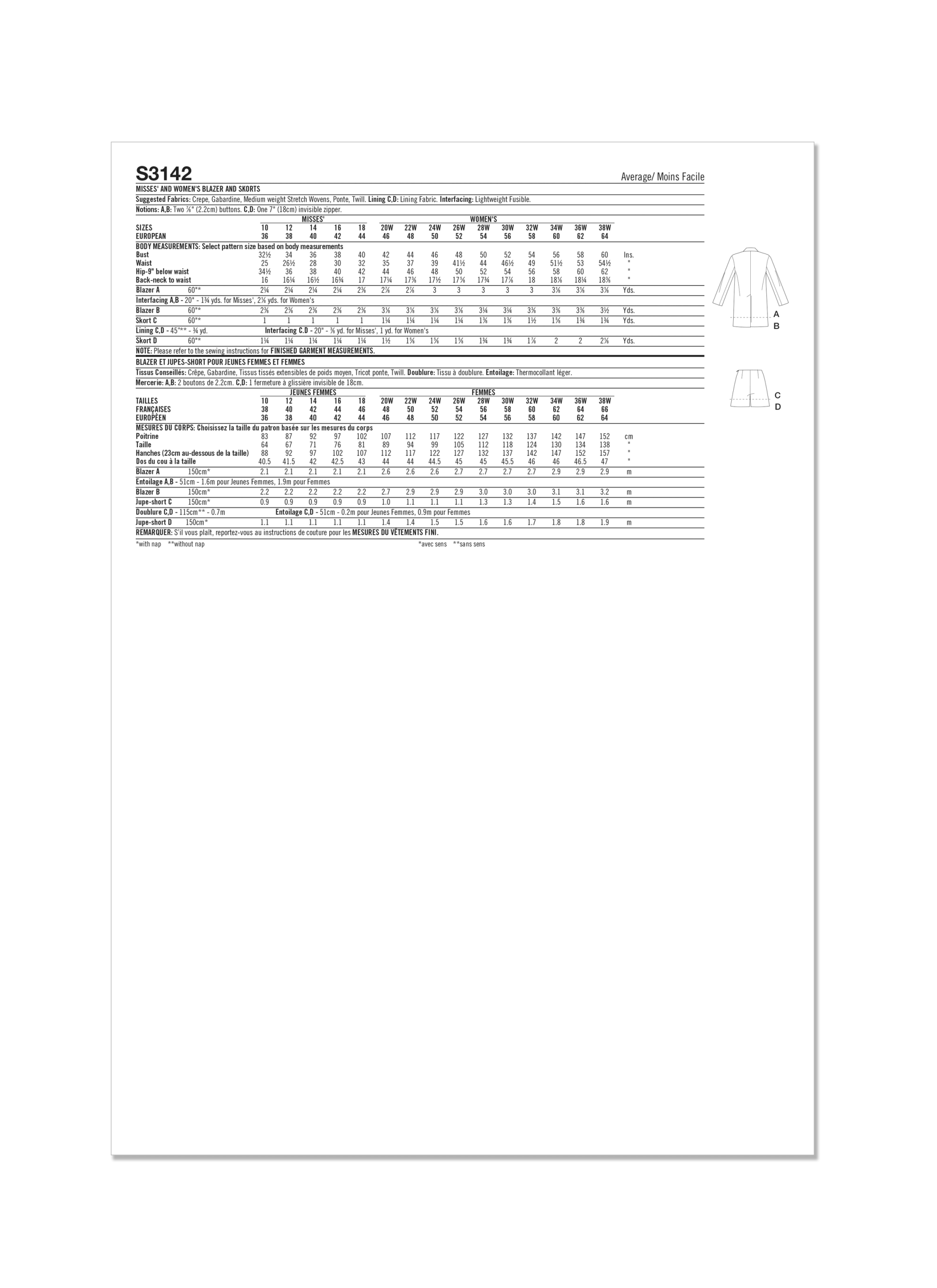 Crepe, Gabardine, Medium weight Stretch Wovens, Ponte, Twill. Lining C,D: Lining Fabric. Interfacing: Lightweight Fusible.