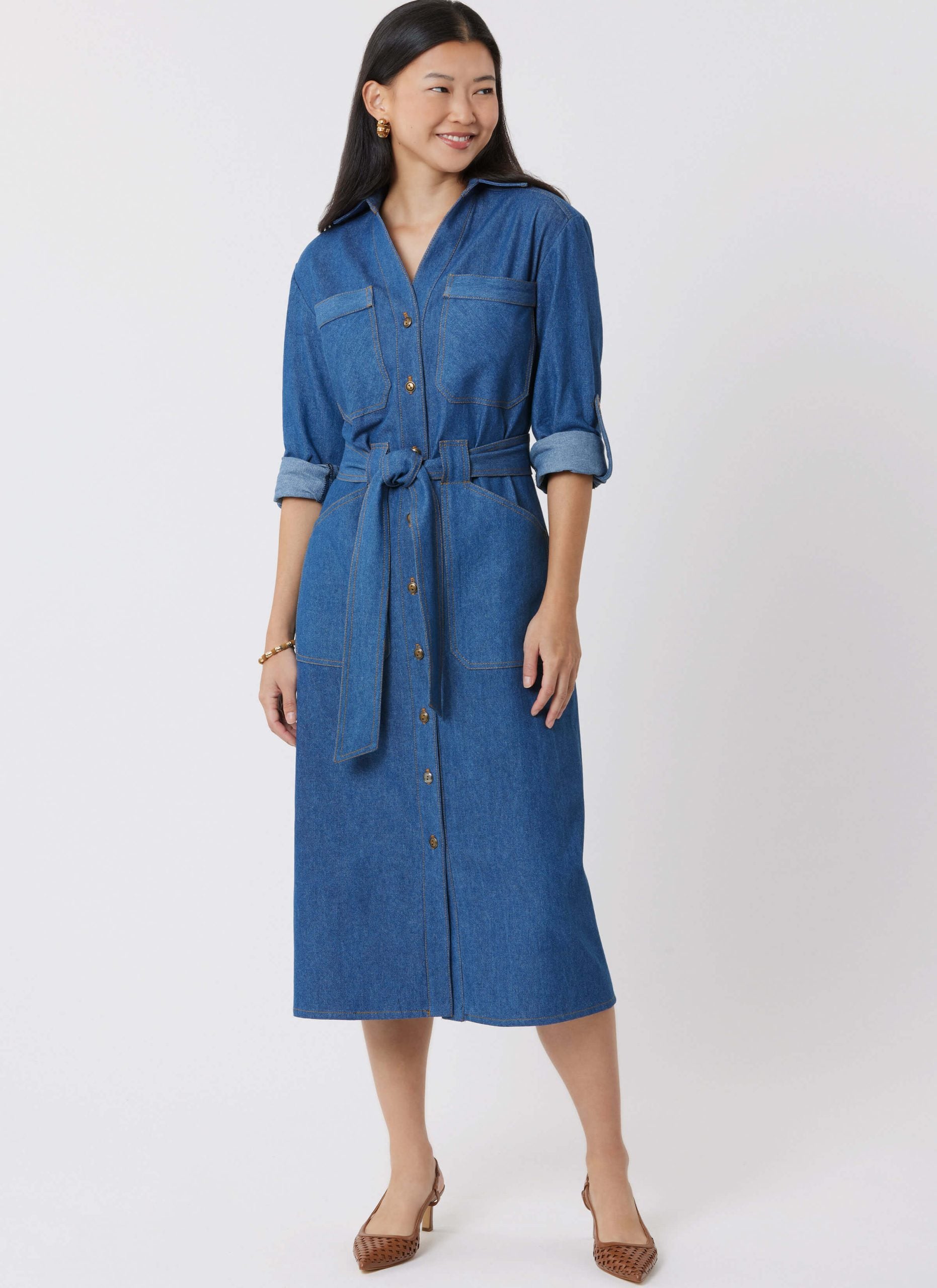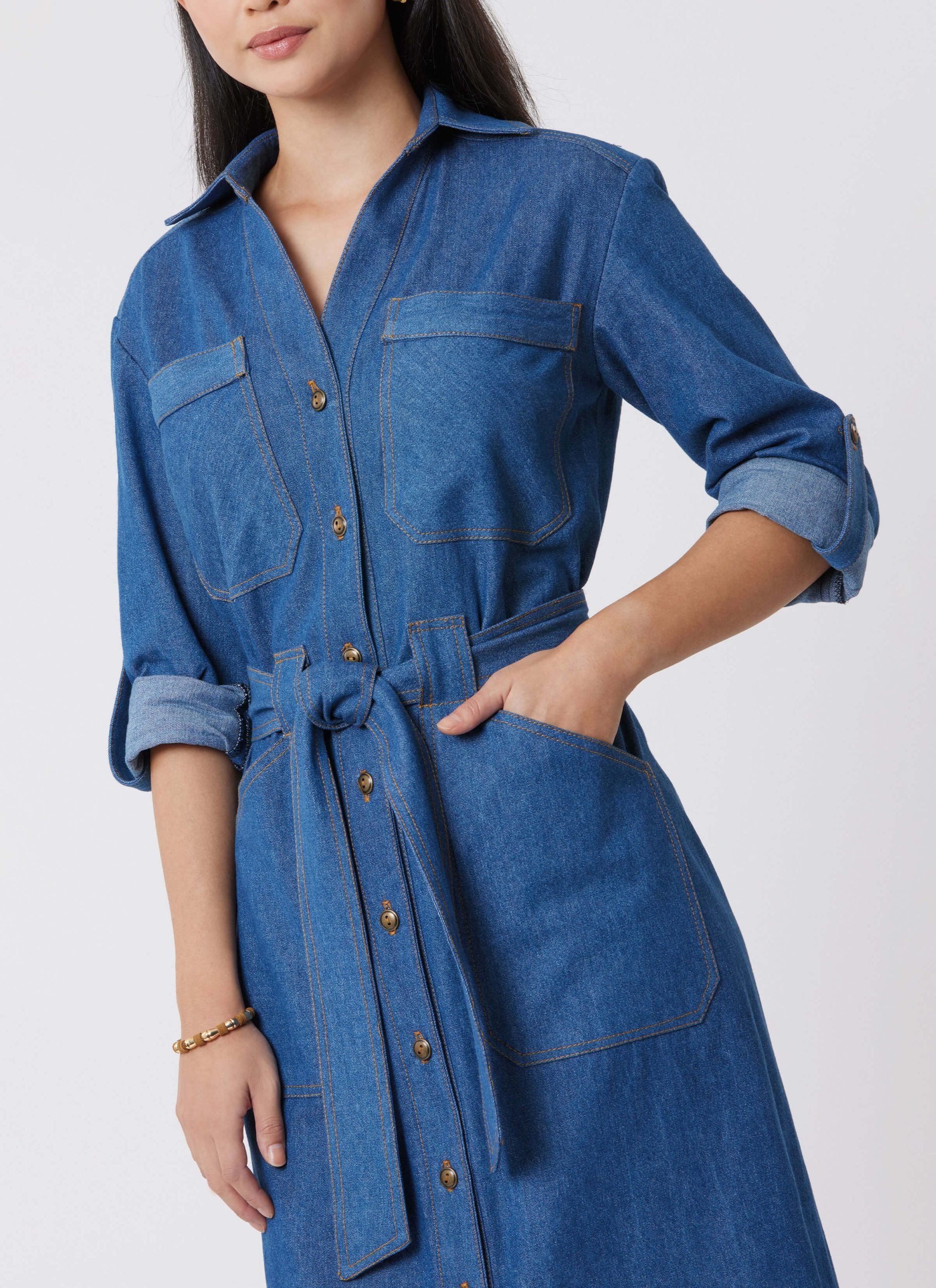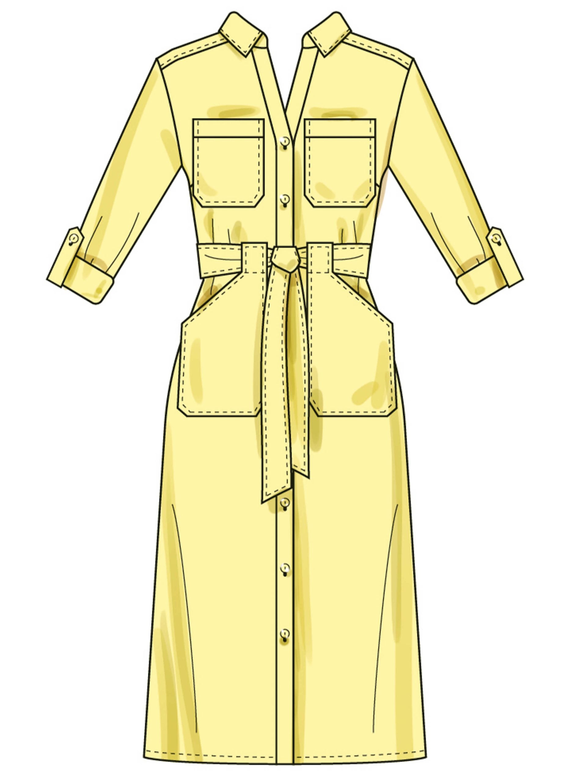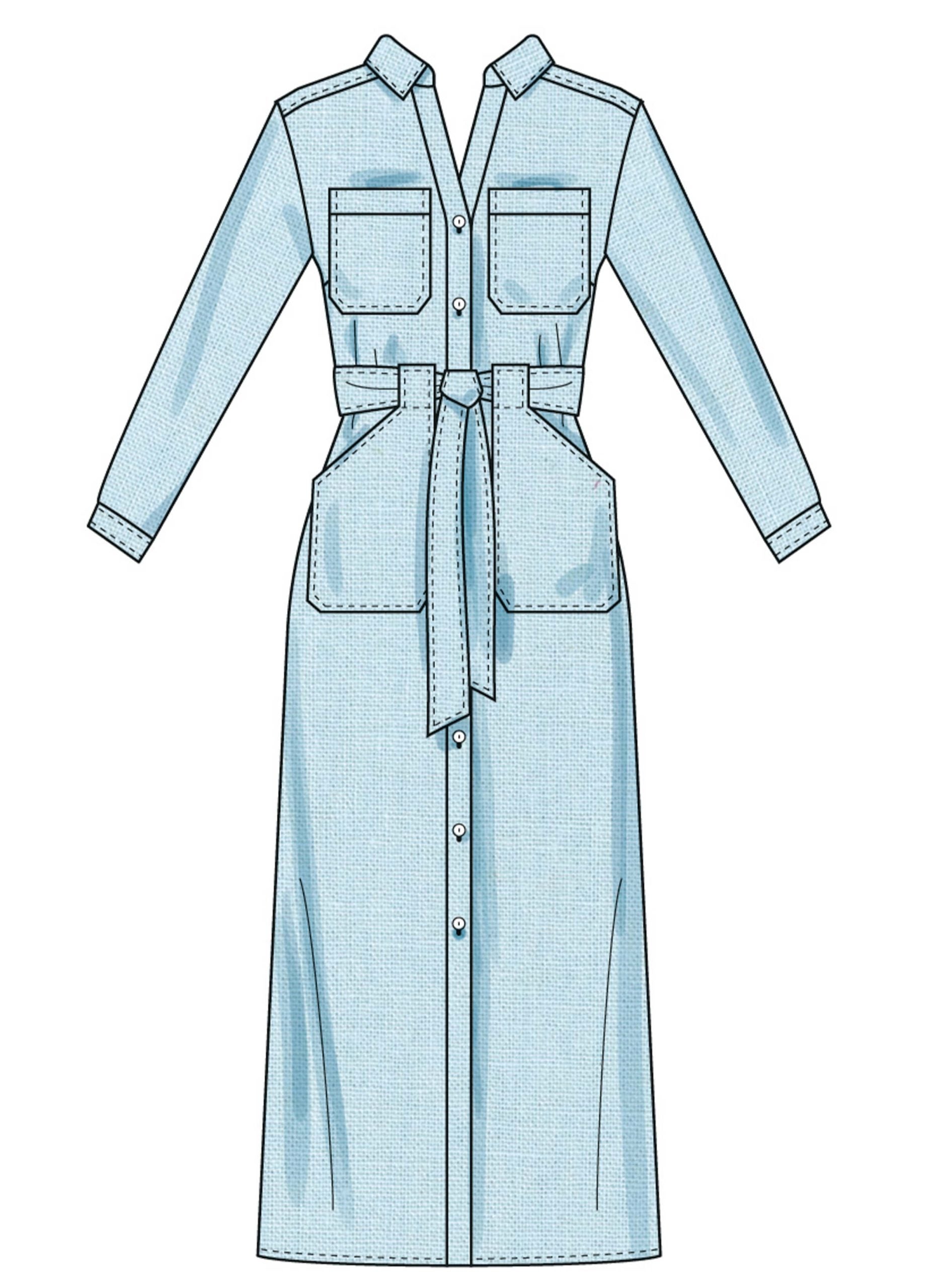 Dresses in three versatile lengths feature a classic front button opening with a structured collar and collar band for a polished finish. The design includes relaxed dropped shoulders for a comfortable, easy fit, along with functional front patch pockets that add both style and practicality. Shaping is enhanced with a back yoke and back darts, creating a flattering silhouette while maintaining a relaxed feel.