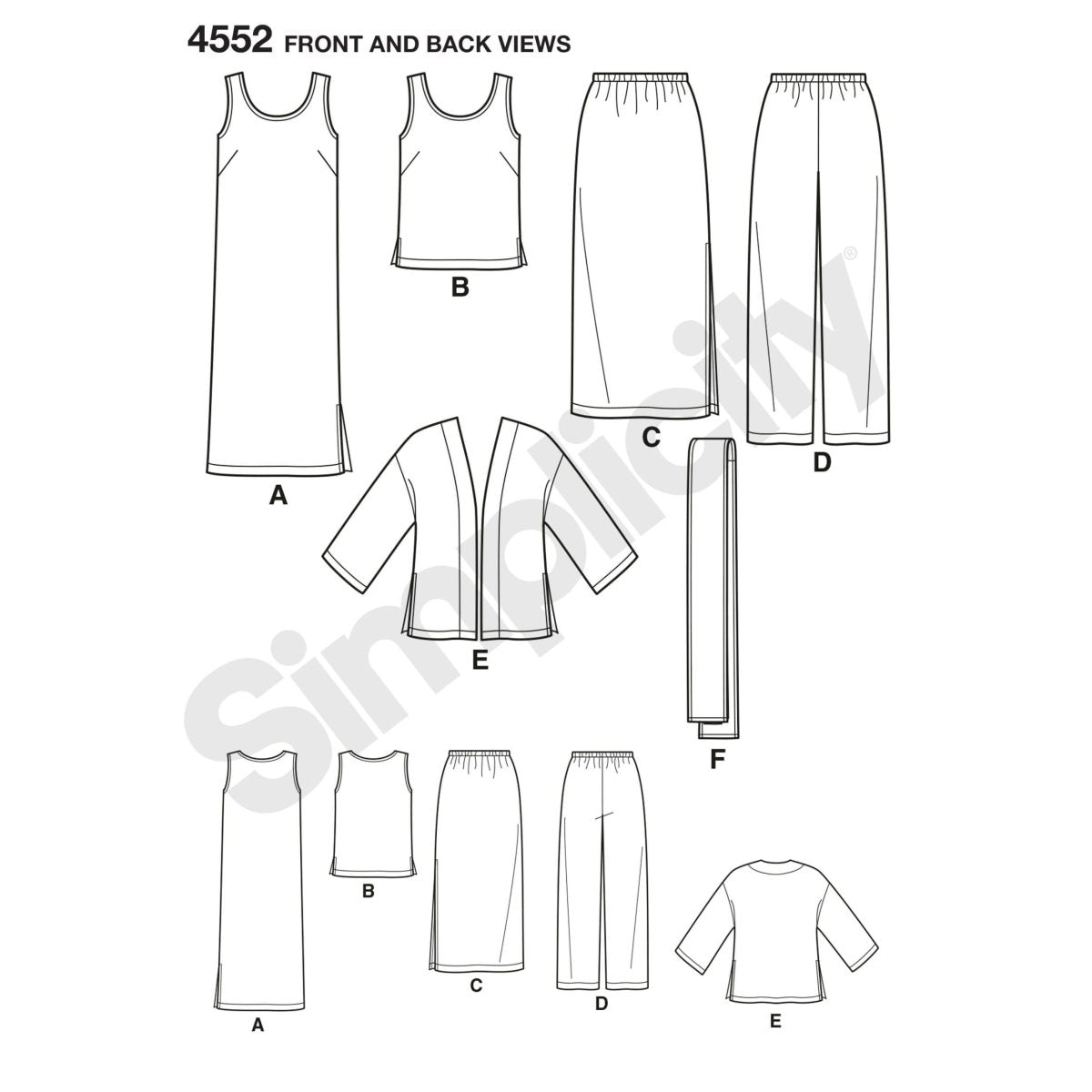 Simplicity S4552 is a versatile Misses’ and Plus Size sewing pattern designed to create a coordinated, mix-and-match wardrobe. The pattern includes a relaxed tank-style dress and top featuring clean lines and an easy, comfortable fit. It also includes a loose-fitting kimono-style jacket that layers effortlessly over the garments for a stylish and modern finish.