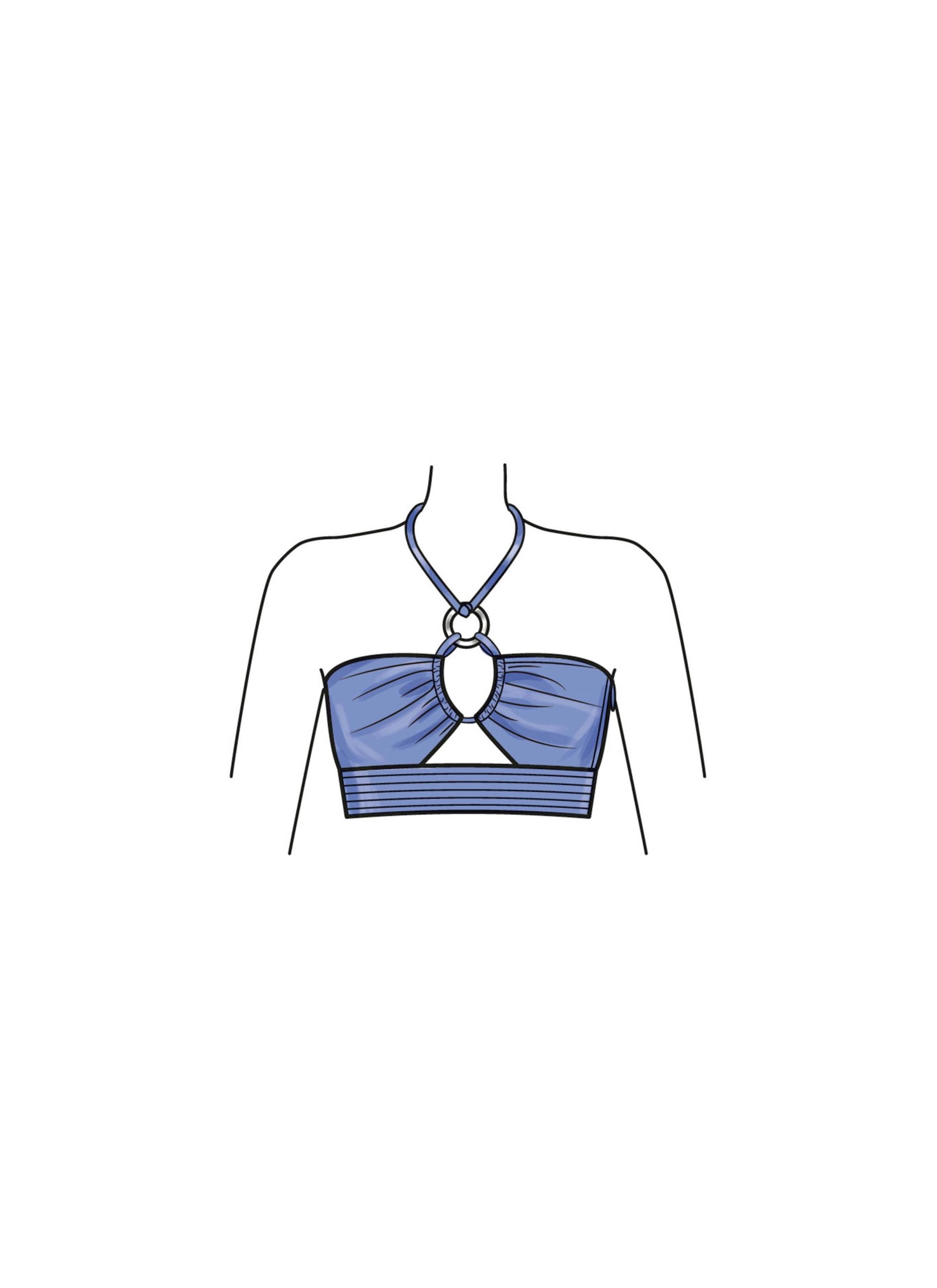 Relaxed-fit, button-front shirt featuring a classic collar, long sleeves with structured cuffs, and a back yoke with soft pleating for added movement and comfort. The pull-on trousers are designed with a flexible elastic waistband and adjustable self-tie detail for a flattering and customizable fit. The cropped halter-style top showcases a modern cut-out feature with an O-ring accent, connecting to the bodice with delicate loops for a stylish, statement finish. Sewing Difficulty Rating: Average, suitable for sewists with some garment construction experience.