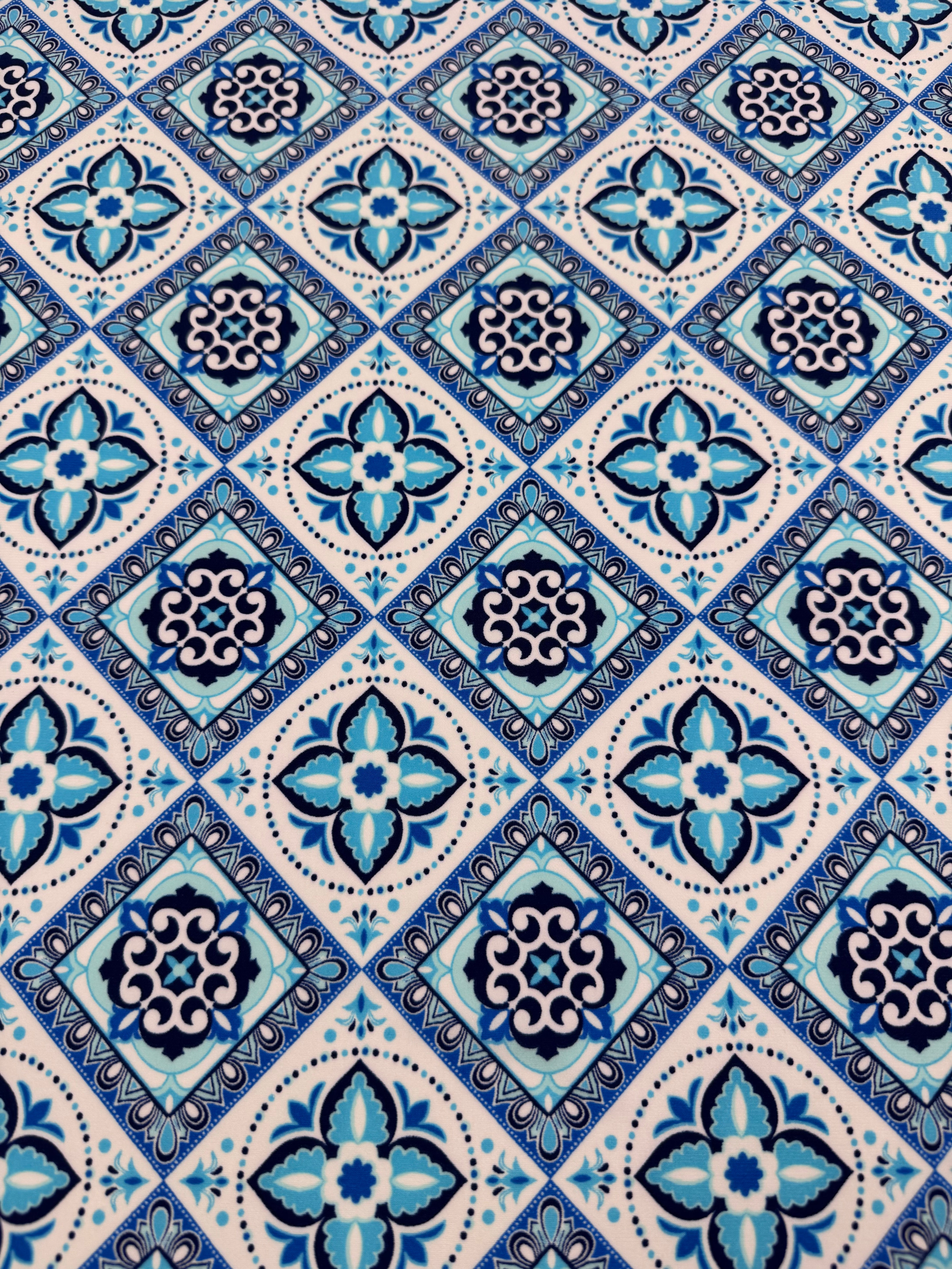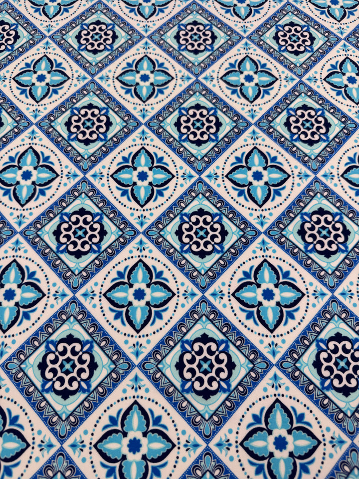 Our Printed Lycra is a Polyester/Spandex fabric that has a two-way stretch and comes in a variety of beautiful prints! Printed Lycra is a medium-weight fabric, has good durability and stretch, and washes well. Our Lycras are perfect for making tops, dresses, skirts, pants, accessories, and even childrenswear. An intricate multi-coloured paisley with teal, orange, pink, and green accents.