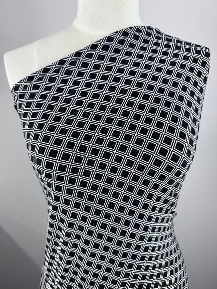 Our Printed Lycra is a Polyester/Spandex fabric that has a two-way stretch and comes in a variety of beautiful prints! Printed Lycra is a medium-weight fabric, has good durability and stretch, and washes well. Our Lycras are perfect for making tops, dresses, skirts, pants, accessories, and even childrenswear. An intricate multi-coloured paisley with teal, orange, pink, and green accents.
