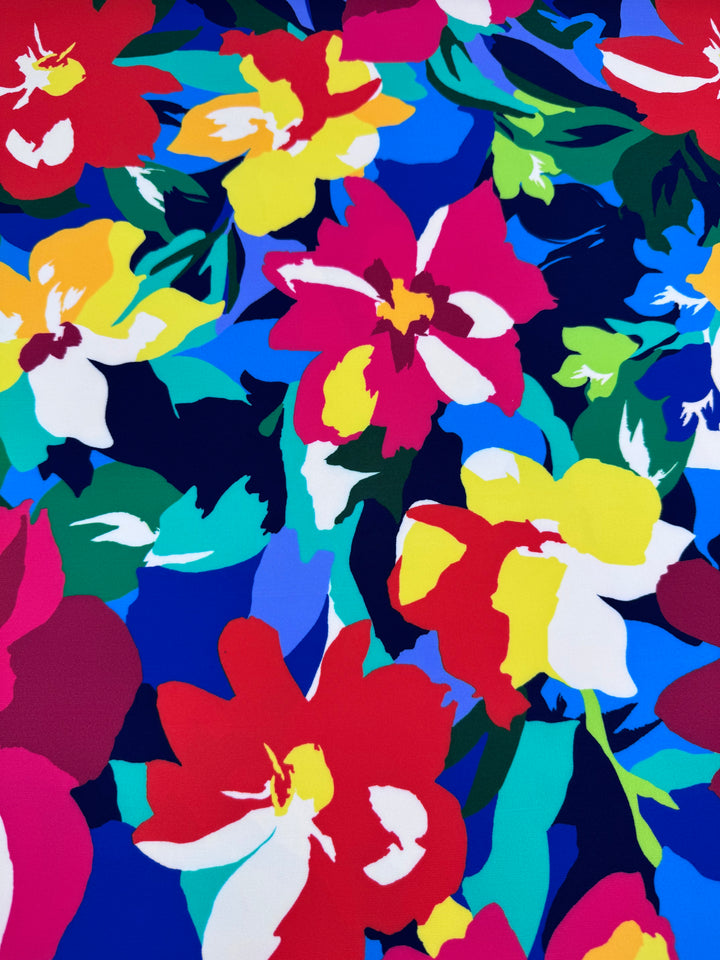 Our Printed Lycra is a Polyester/Spandex fabric that has a two-way stretch and comes in a variety of beautiful prints! Printed Lycra is a medium-weight fabric, has good durability and stretch, and washes well. Our Lycras are perfect for making tops, dresses, skirts, pants, accessories, and even childrenswear. An intricate multi-coloured paisley with teal, orange, pink, and green accents.