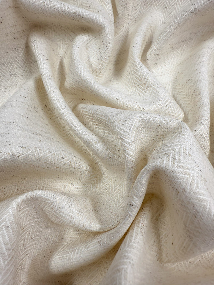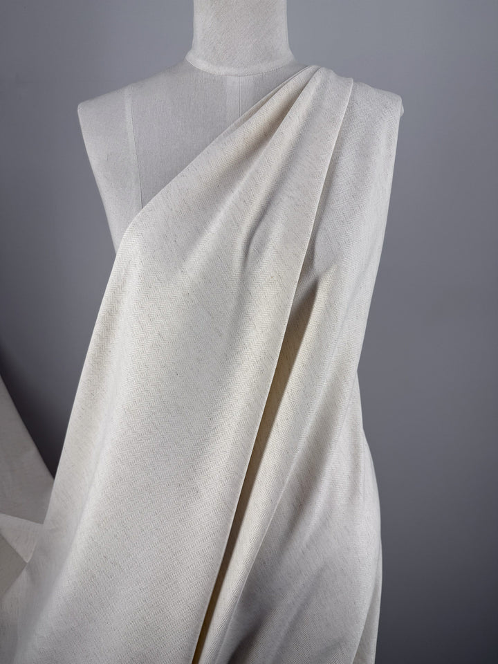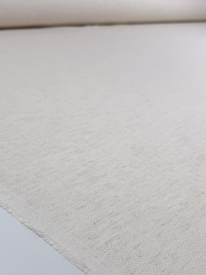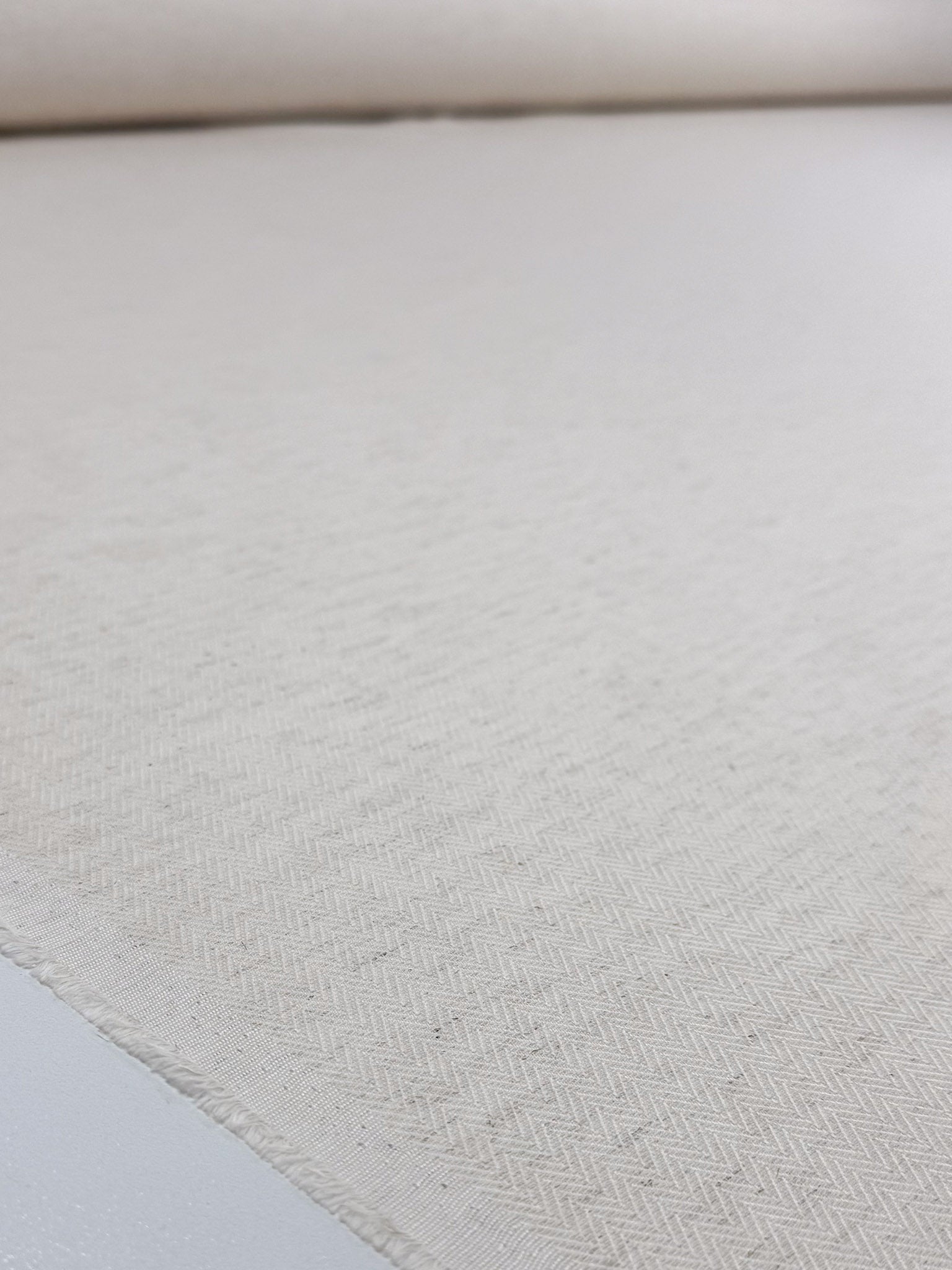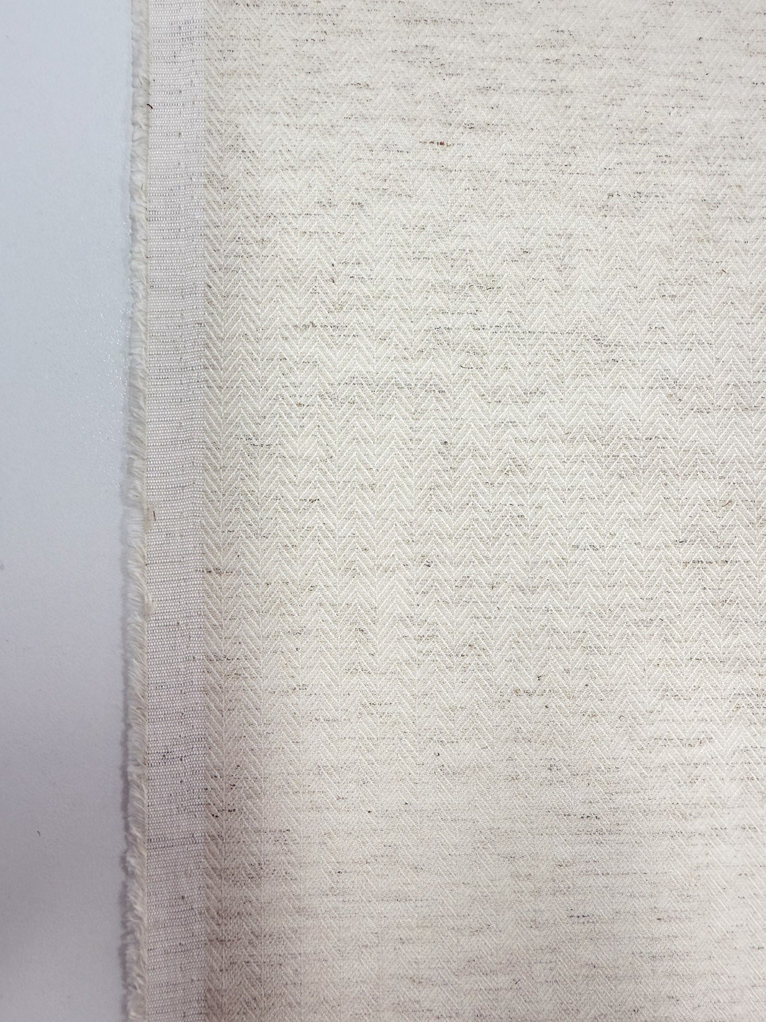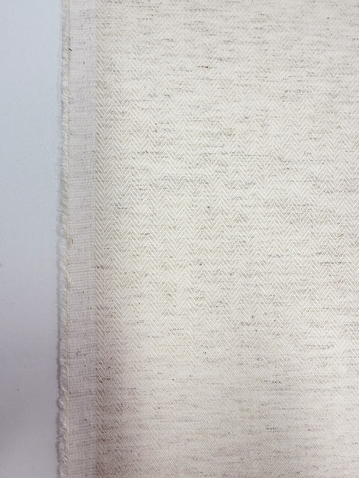 A pure linen fabric in natural colour that is a bit speckled and has an elegant herringbone weave.
