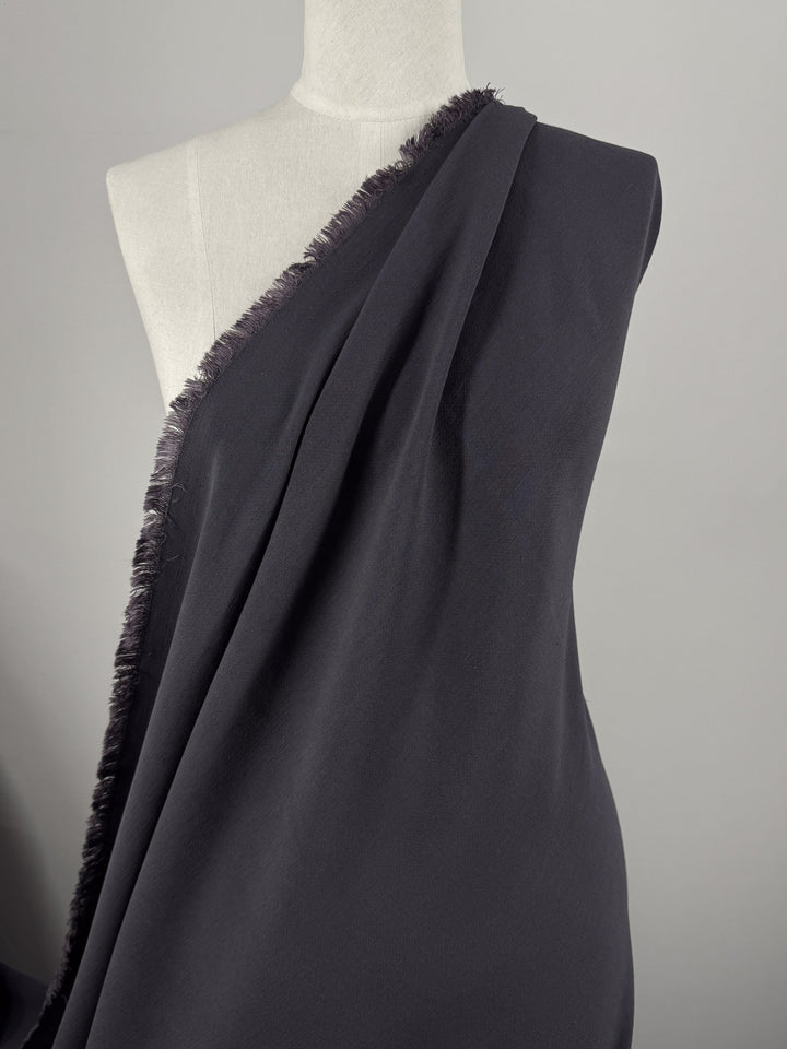 A pure linen crepe fabric in a deep charcoal/navy with a purple tinge throughout with a soft, fluid drape.