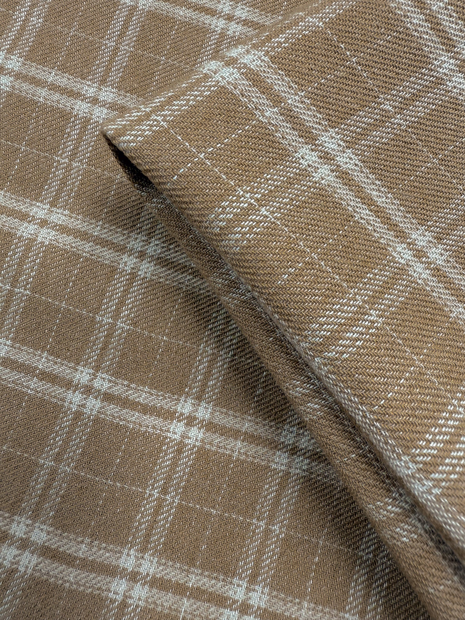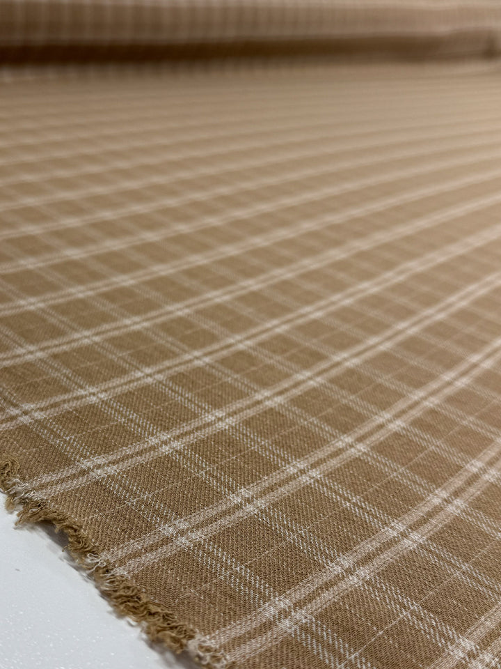 A light to medium weight soft checked twill tweed pure linen with muted tan and white.
