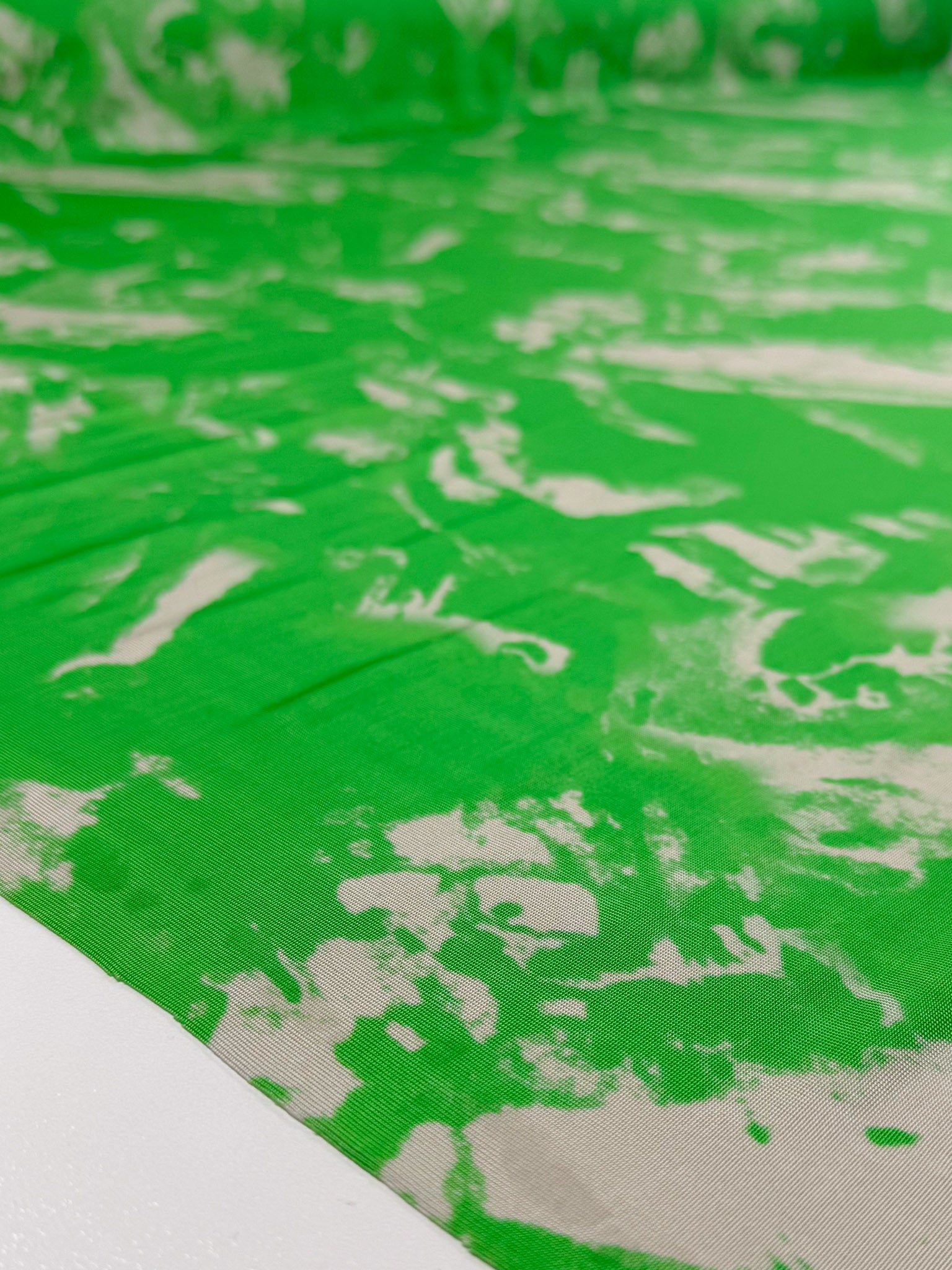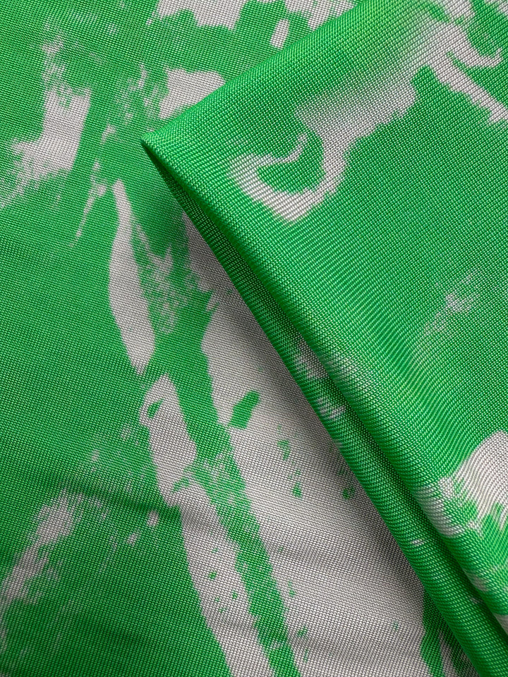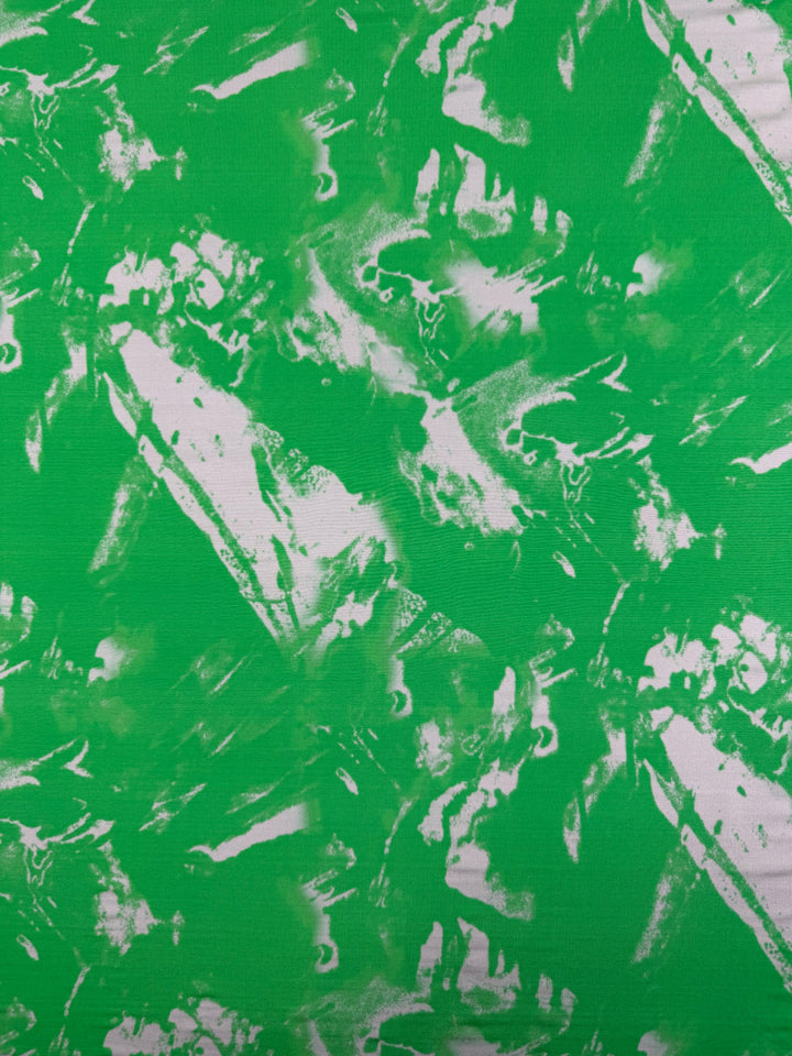 A vibrant green printed viscose knit with a washed marbled look.