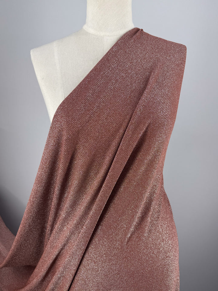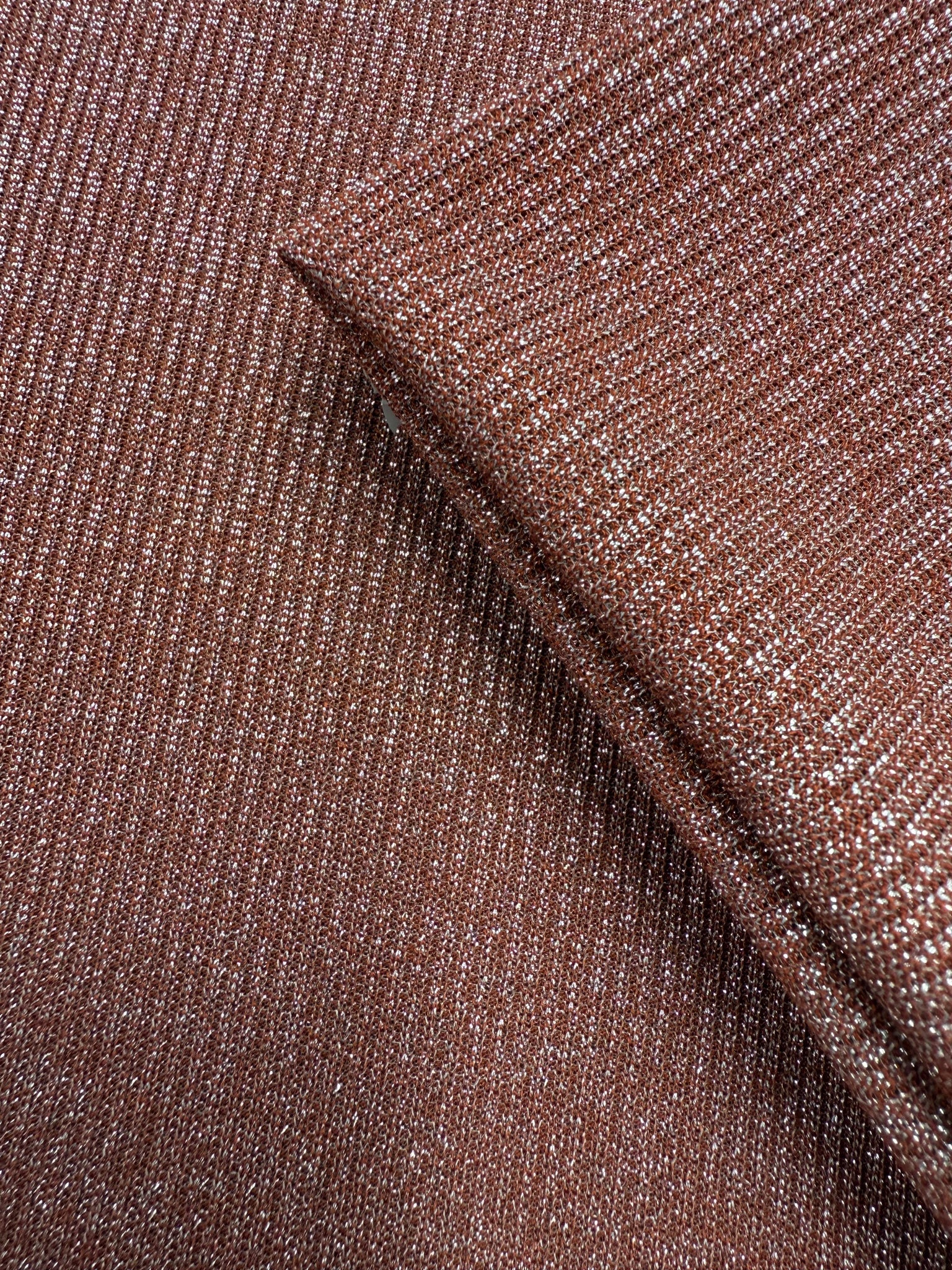 A rich viscose lurex knit with a subtle shimmer and soft, fluid drape. Lightweight and comfortable, this ribbed Knit is ideal for elegant tops, dresses, and relaxed eveningwear.